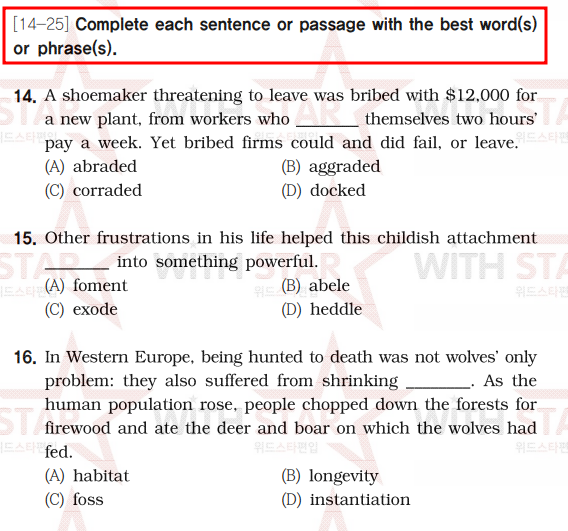 그렇습니다. 문제 유형은 밑 줄 부분의 문법적인 오류를 찾아내는 전형적인 형태입니다. 하지만 앞서 풀이해야하는 어휘 파트의 난이도와 밑 줄 유형의 풀이 속도를 감안했을 때, 문법 문항들을 풀어내는데 시간 배분을 적절하게 하는 것이 조금 어려울 수 있어보입니다.